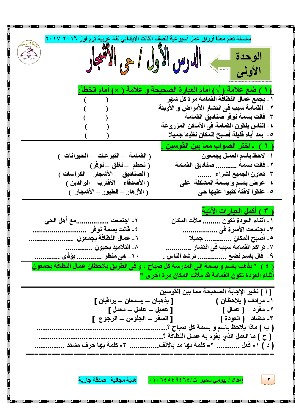 اوراق عمل للصف الثالث الابتدائي لغة عربية منسق وجاهز للطباعه من اعداد الاستاذ بيومي سمير