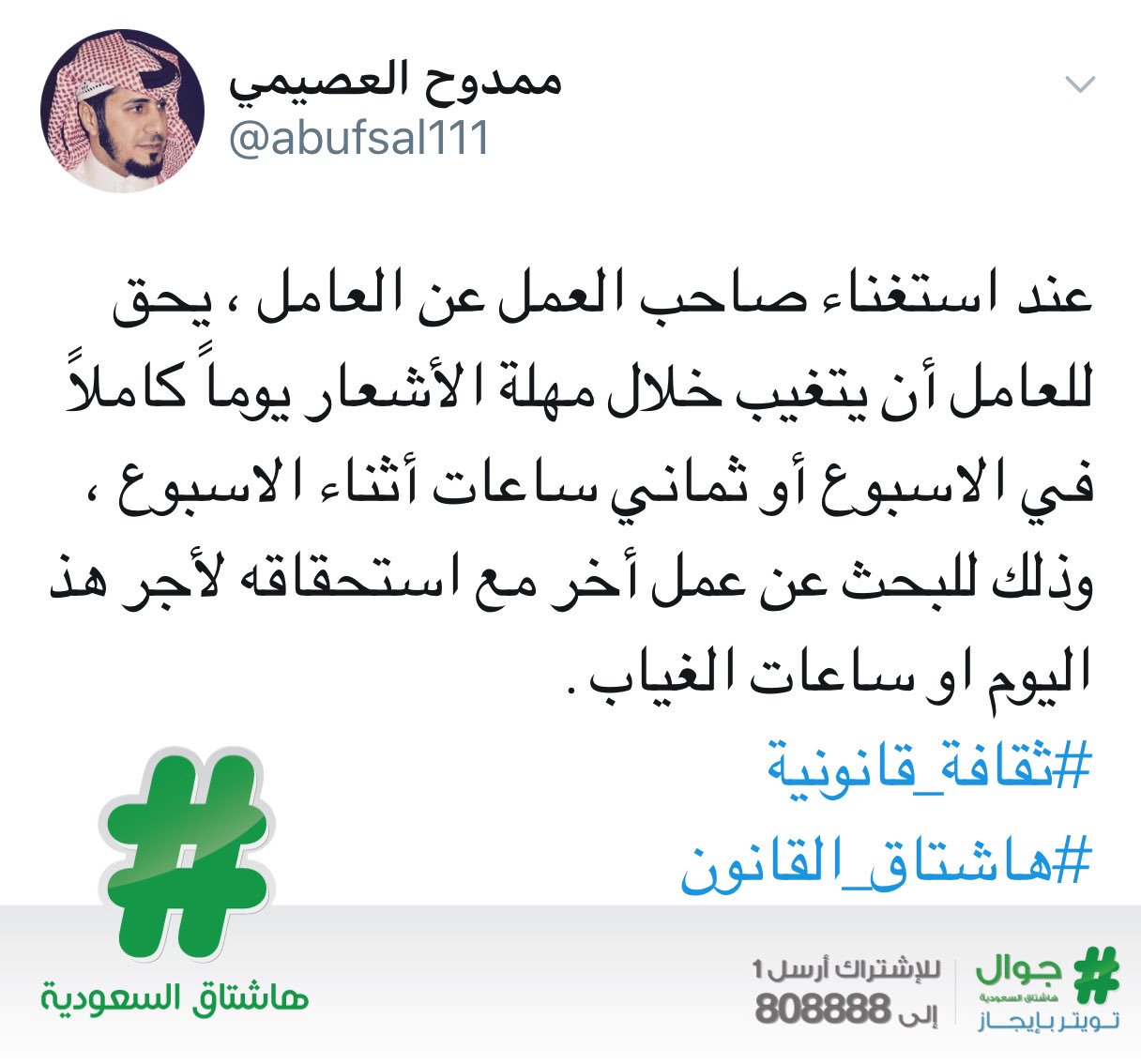 هاشتاق السعودية Sur Twitter بهدف البحث عن عمل آخر العصيمي يؤكد أحقية العامل في الغياب يوما كاملا أو ثماني ساعات في الأسبوع مع استحقاق كامل الأجر وذلك خلال مهلة إشعار الاستغناء