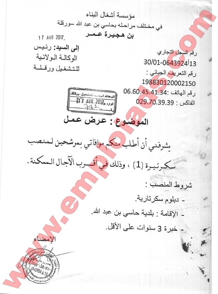 اعلان عن عرض عمل بمؤسسة اشغال البناء ولاية ورقلة افريل 2017