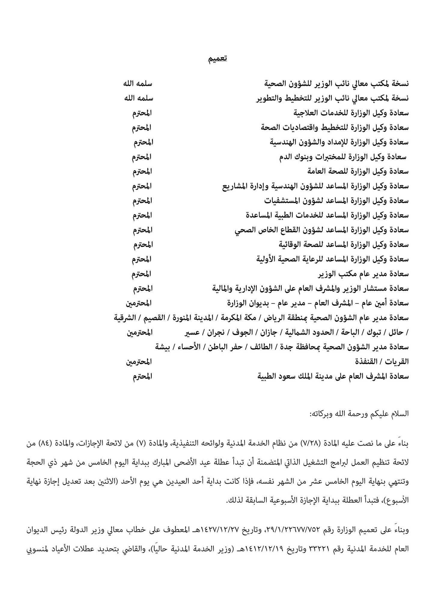 الصحة لمنسوبيها تعديل إجازة عيد الأضحى عن طريق موارد قبل عمل المباشرة صحيفة تواتر الالكترونيه