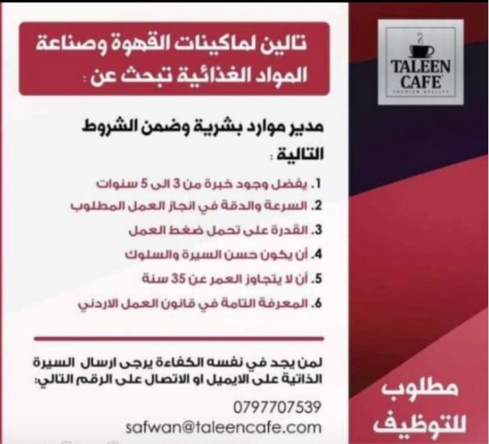 مطلوب مدير موارد بشرية للعمل لدى شركة تالين لماكينات القهوة وصناعة المواد الغذائية واحة الوظائف
