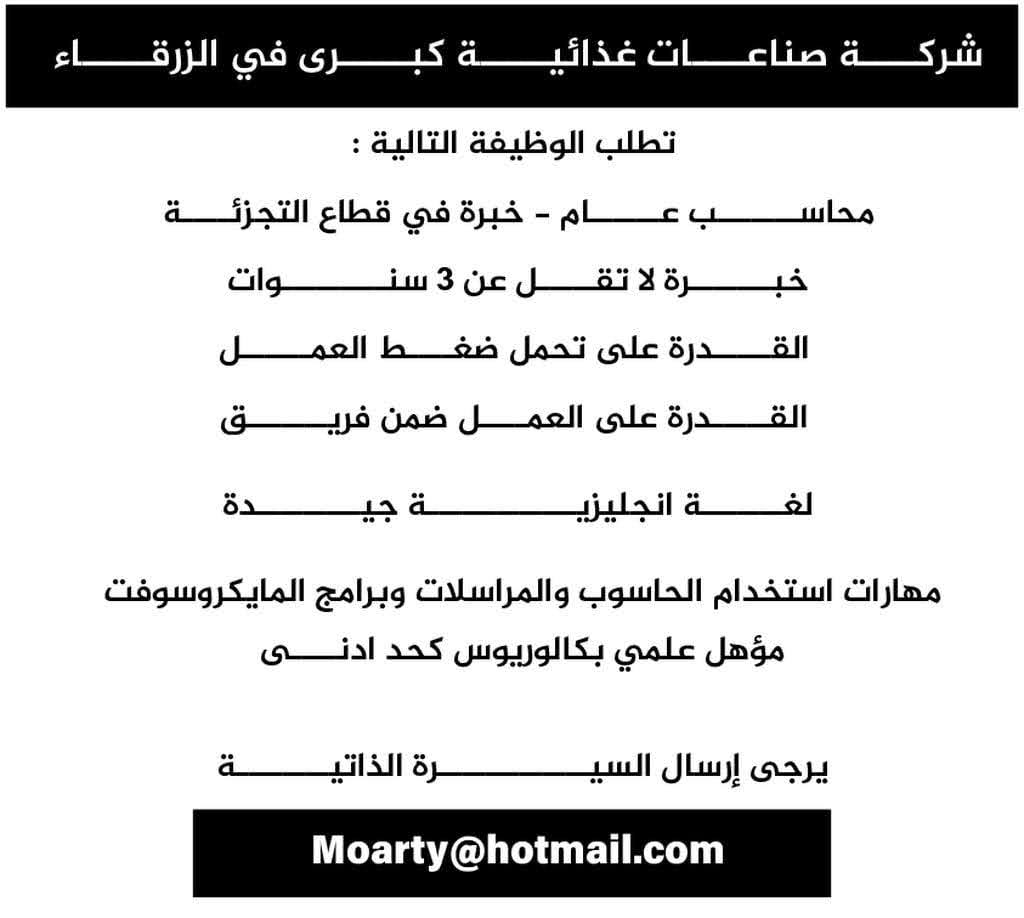 شركة صناعات غذائية في الزرقاء تبحث توظيف محاسب عام واحة الوظائف