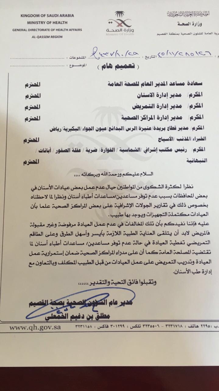 د عادي الزبني Su Twitter صحة القصيم الزام التمريض بتغطية العمل في عيادات الأسنان في حال عدم توفر مساعد طبيب أسنان وزارة الصحة