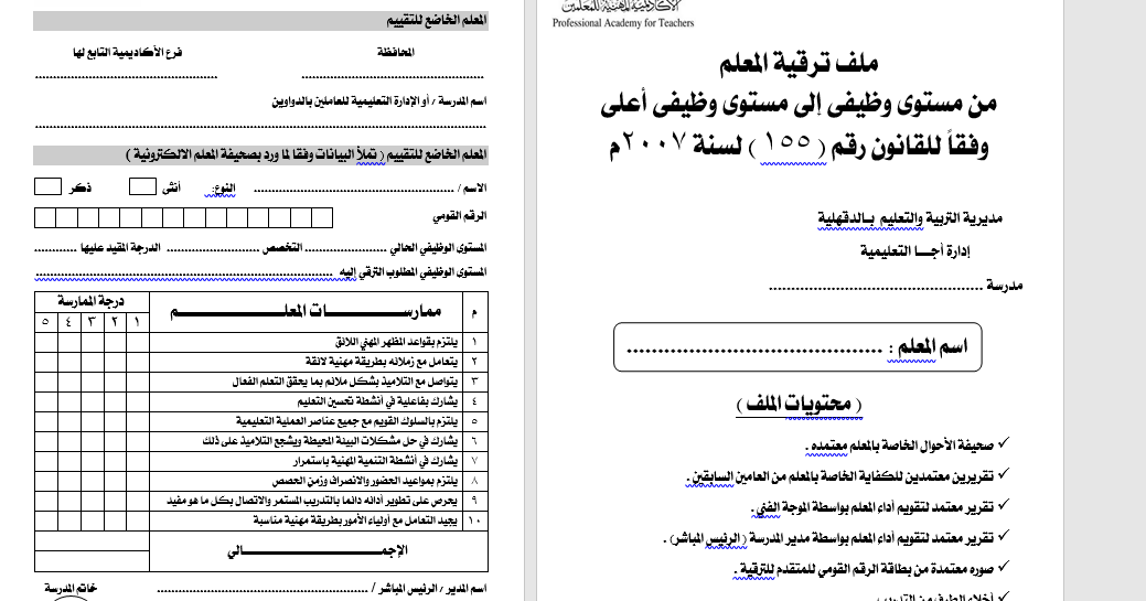 ملف ترقية معلم بصيغة Pdf و Doc كامل بجميع محتوياته لمن أمضي خمس سنوات على الكادر أو أخر ترقيه