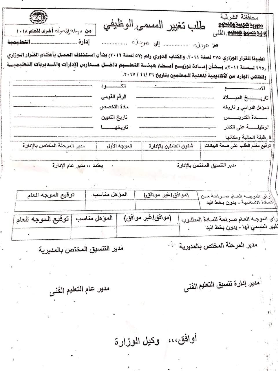 طلب تغيير المسمى الوظيفى للمعلمين من مرحله لاخرى ومادة لمادة والاوراق المطلوبه بجميع المحافظات هنـــا