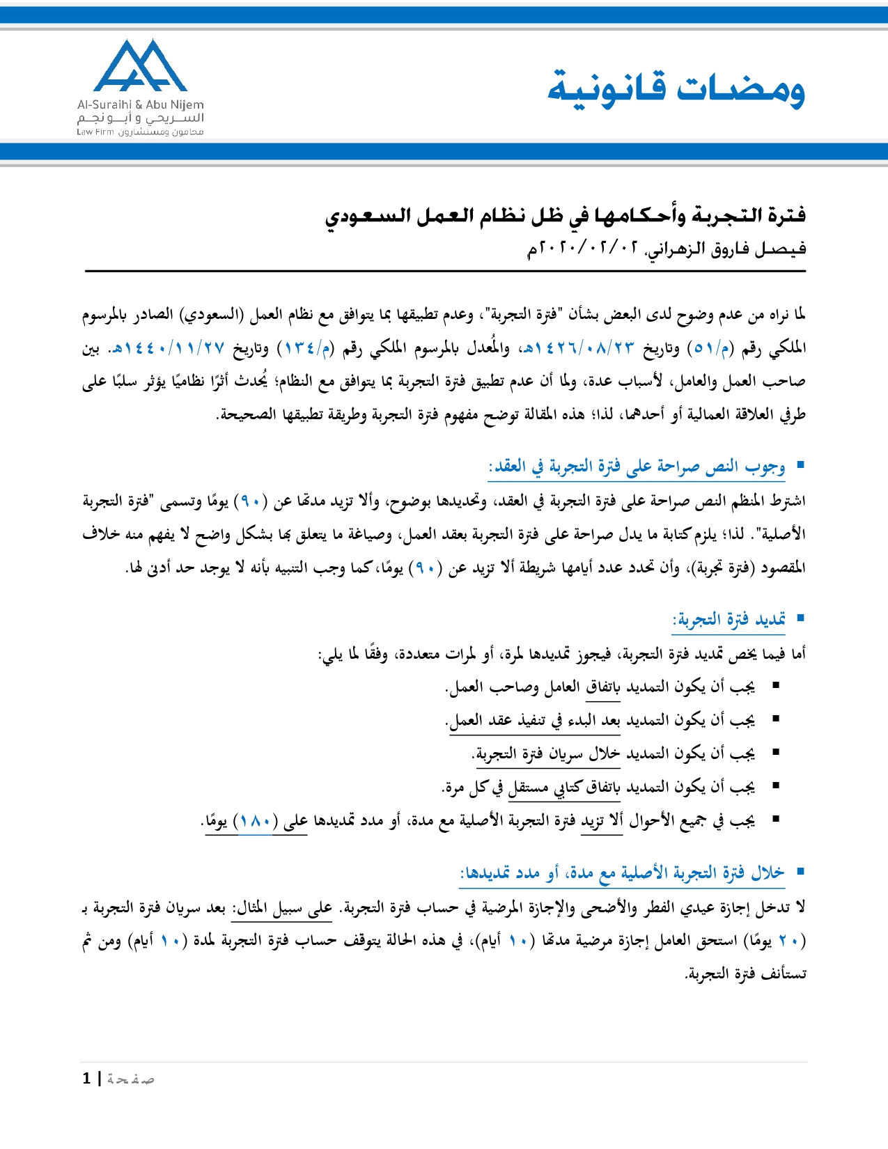 السريحي وأبو نجم محامون ومستشارون Pa Twitter ثاني مقالات فريق العمل لعام 2020م عنوان المقال فترة التجربة وأحكامها في ظل نظام العمل السعودي لغة المقال اللغة العربية كاتب المقال Faisal Aljandbi رابط المقال