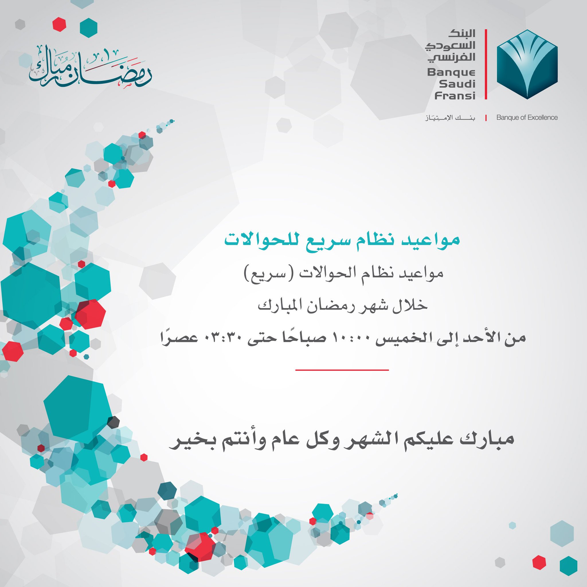 البنك السعودي الفرنسي בטוויטר مواعيد عمل نظام الحوالات سريع خلال شهر رمضان من الأحد إلى الخميس 10 00 صباح ا حتى 3 30 عصر ا مبارك عليكم الشهر وكل عام وأنتم بخير Https T Co Vr4fmehzvb