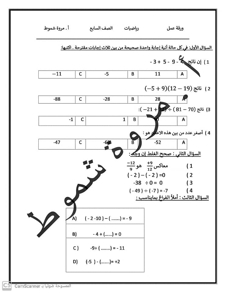 ورقة عمل في الرياضيات للصف السابع الفصل الاول 2020 2021