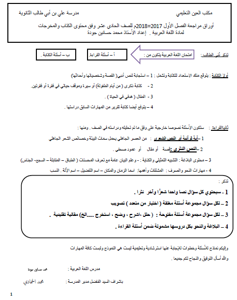اللغة العربية أوراق عمل مراجعة للصف الحادي عشر ملفاتي