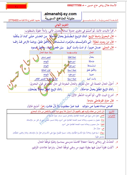 اوراق عمل درس الحال مع الحل لغة عربية ثامن الفصل الأول زاد