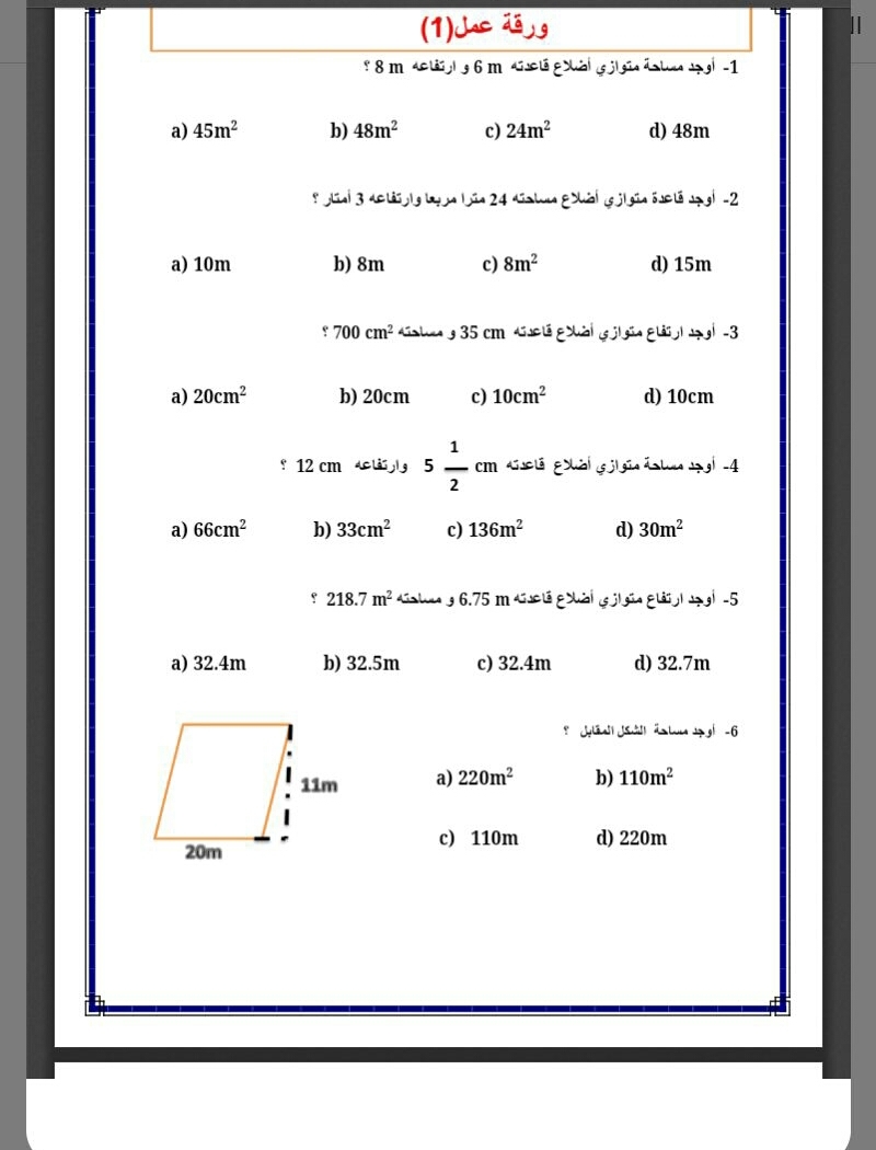 ورقة عمل مساحة متوازي الاضلاع