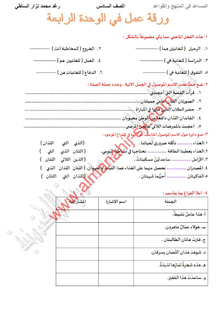 ورقة عمل شاملة الوحدة الرابعة من منهاج اللغة العربية للصف السادس الفصل الثاني 2019 2020